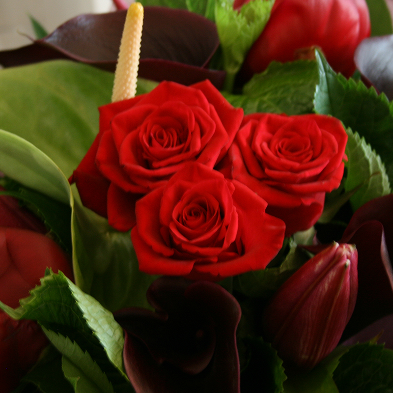 A sprinkling of romantic red roses surrounded by a seasonal palette of deep shades of reds, magentas, burgundies, maroons or deep pinks and matching tones. Lush, rich and opulent tones and red hues or a bit more hot pinks or more maroon or deeper shades, leave this one to us. We will create a florist choice bouquet with a similar, look, feel and style to the bouquets pictured but may not have the exact blooms due to daily flower changes and seasonal availability. Gift wrapped for a lovely presentation.
